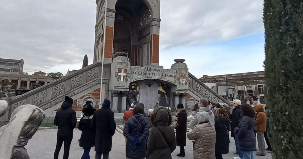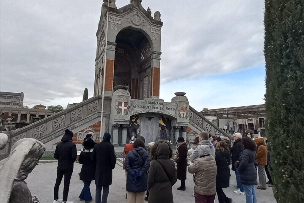Il primo “viaggio” di ieri, ci ha condotto al Cimitero Monumentale, dove i Ciceroni ci hanno accompagnato in un luogo suggestivo, che ci lega indissolubilmente alla storia di chi ci ha preceduto e ha reso Legnano la città che oggi conosciamo. Come moderni “cantastorie” ci hanno narrato la vita di famiglie che più di un secolo fa, e in tempi più recenti, si sono adoperate per rendere Legnano una città fortemente legata al territorio ma in connessione con il mondo. Dai Cozzi, ai Tosi, da Musazzi a Pagani, il viaggio non è stato solo storico ma ha toccato corde di intensa ed emozionante umanità. La bravura dei Ciceroni nell’esporre storie e aneddoti , che possiamo paragonare a una forma di “teatro di narrazione”, ha coinvolto tutti i partecipanti. Altrettanto toccanti i momenti di “incontro” alla Cappella della Famiglia Tosi, dove un emozionato ex dipendente ha raccontato la storia della famiglia, e l’incontro con Michela Bonzi, mamma di Bianca Ballabio che all’ingresso della cappella di famiglia ha raccontato della figlia Bianca, scomparsa prematuramente, e della Fondazione a lei dedicata.
