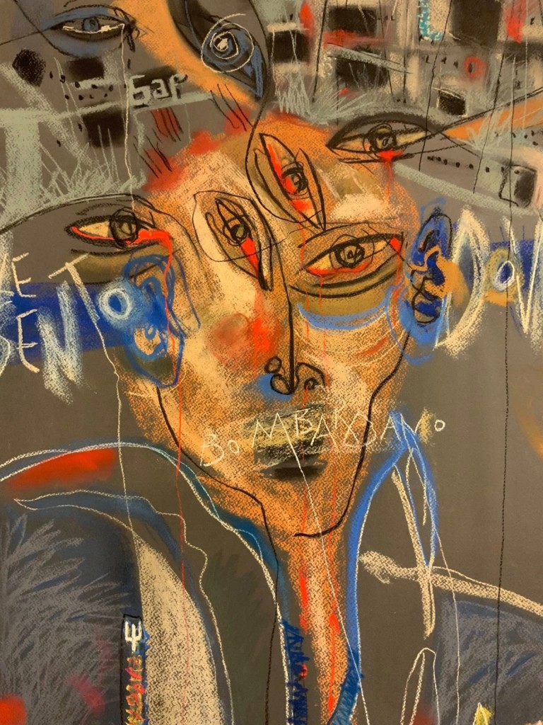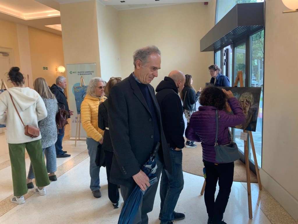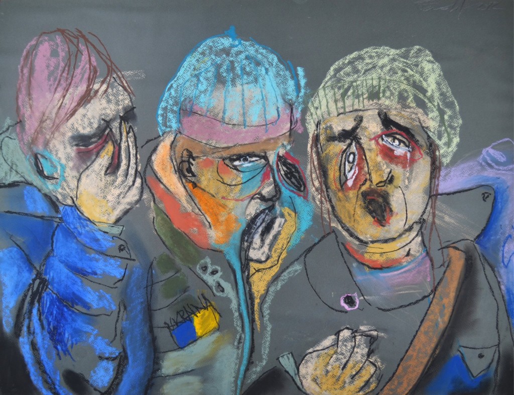 La concomitanza con la Domenica delle Palme è stata del tutto casuale, eppure pareva uno strano gioco del caso. Non c’erano ramoscelli di ulivo nel foyer del teatro ma quadri di straziante umanità. Le persone che hanno affolato l’ingresso del teatro, si sono trovate di fronte a immagini che raccontano gli accadimenti di un conflitto a noi prossimo per vicinanza, come fossero degli scatti di un reporage di guerra. Quei volti, quegli sguardi, quegli occhi colmi di muta disperazione e rassegnazione, sono un gesto politico di cui Ferioli si assume tutta la responsabilità. Quei corpi rovesciati sottosopra, quei visi scomposti, quelle bocche spalancate in urla mute, raccontano di questa guerra più di mille articoli e disarticolate opinioni pseudo giornalistiche.